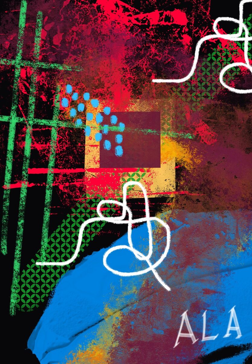 Funky mix of graffiti and digital dreamscape, with voxel art character